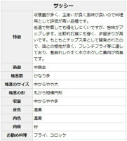 低温で貯蔵しても糖化しにくいですが、旨味がアップします。比較的打撲にも強く、歩留まりが高いです。もともとチップス用として開発されたので、油との相性が良く、フレンチフライ等に適しており、煮崩れしやすくホクホクした黄肉が特長です。 |